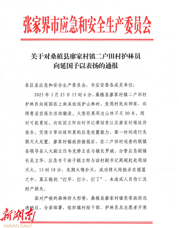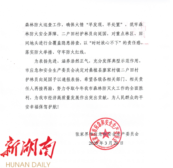 湖南日报·新湖南客户端3月26日讯(通讯员:王维阳)为表扬先进、涵养浩然正气,充分发挥典型示范作用,3月26日,张家界市应急和安全生产委员会决定对桑植县廖家村镇二户田村护林员向延国予以通报表扬。