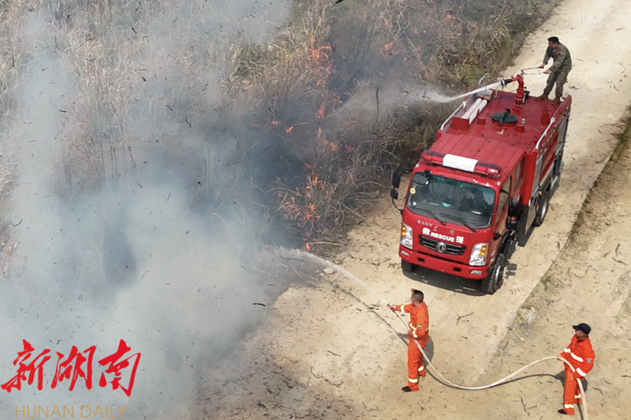 演练过半,田野间突现浓烟,森林防灭火演练紧接着展开。风力灭火机的轰鸣声中,民兵们兵分四路:消防组驾驶消防车迅速到达起火位置,出水喷射控制火情,突击组持打火拖把等装备正面强攻,后勤组架设水泵建立隔离带,警戒组做好火灾现场周围的警戒和守护。背着消防水带的唐源健步如飞,“我们定期巡逻,哪里有易燃植被,哪里有天然水源或者消防水池,早都刻在脑子里了。”