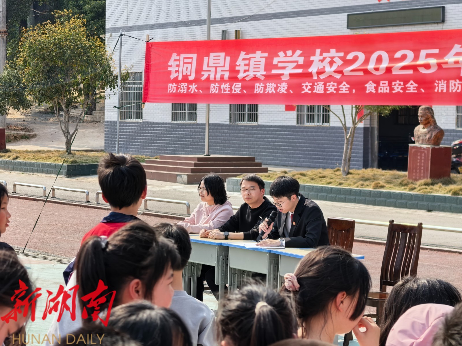 中方融媒3月27日讯 (通讯员:丁彭 张静芝)3月25日,铜鼎镇政府、镇妇联与铜湾法庭紧密协作,走进铜鼎学校,为全校100余名师生带来了一场别开生面的 “开学安全第一课”活动。活动围绕预防校园欺凌、防溺水以及消防安全等核心内容展开,通过丰富多样的形式,为学生们筑牢安全防护网。