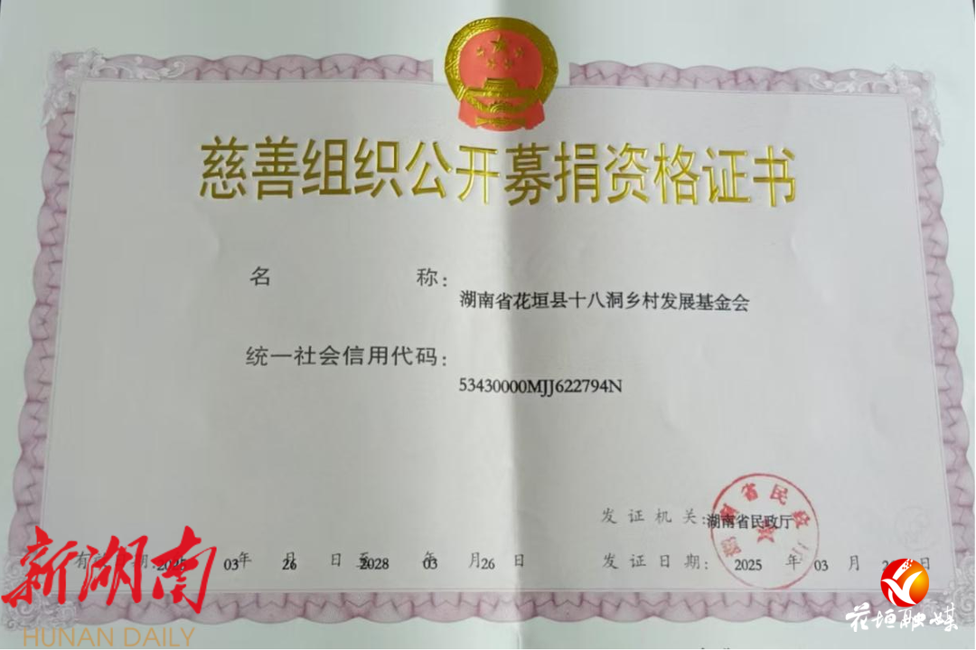湖南日报·新湖南客户端3月28日讯(通讯员: 袁昌俊 吴奇刚 ) 3月26日, 经湖南省民政厅核准,湖南省花垣县十八洞乡村发展基金会正式获得公开募捐资格证书,成为全省首家具有公开募捐资格的县级乡村发展基金会,这一里程碑标志着我县公益行业进入一个新的时期,是“公益事业赋能乡村振兴”新模式的成功实践。