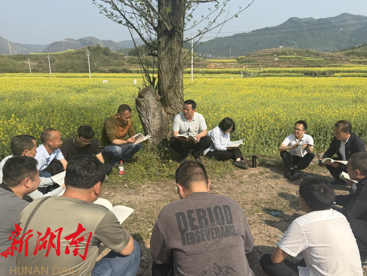走进油菜花海,金黄的油菜花随风摇曳,铜湾镇的20余名青年党员们围坐在一起,开启了一场充满诗意的经典阅读之旅。他们手捧党的经典著作和清廉文化书籍,在花海的怀抱中认真研读。微风轻拂,翻动着书页,也吹动着青年党员们求知的心。有的党员轻声诵读经典段落,有的党员与身边的同志热烈讨论,思维的火花在交流中碰撞。“以前学习理论知识比较枯燥,这次在花海中阅读是全新的体验,感觉特别放松,理解得也更深刻了。”青年党员陈晶晶兴奋地说道。