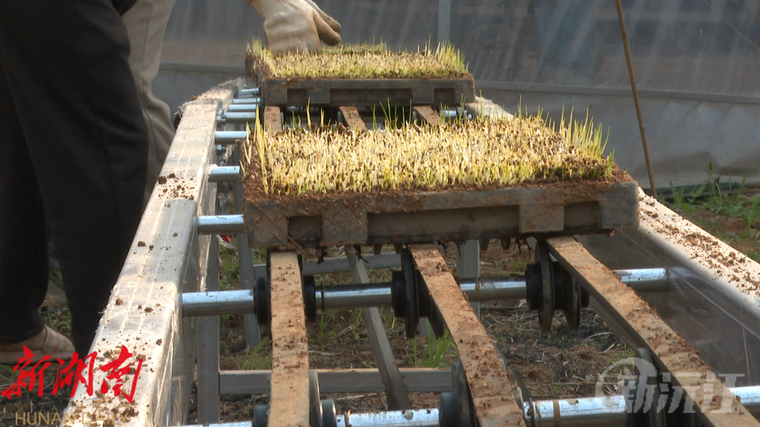 南嘴镇富民农机专业合作社负责人李军介绍道:“今天大棚里都是机插秧,我自己种植了两三百亩地,周边农户加起来有一千多亩。目前,大棚育秧工程即将收尾。”
