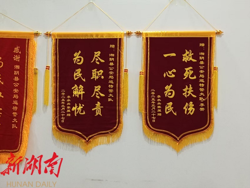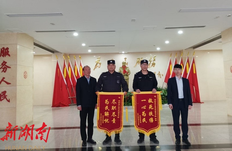 湖南日报·新湖南客户端3月28日讯(通讯员 徐晚晴 )“幸好你们出警及时、处置得力,我母亲才得以脱离危险,你们真是实实在在为民办实事。”3月28日,市民张先生将印有“救死扶伤、一心为民”“尽职尽责、为民解忧”的 锦旗送到湘阴县公安局巡逻警察大队民警手中,对民警及时救助其晕倒在地的家人表示高度赞扬。