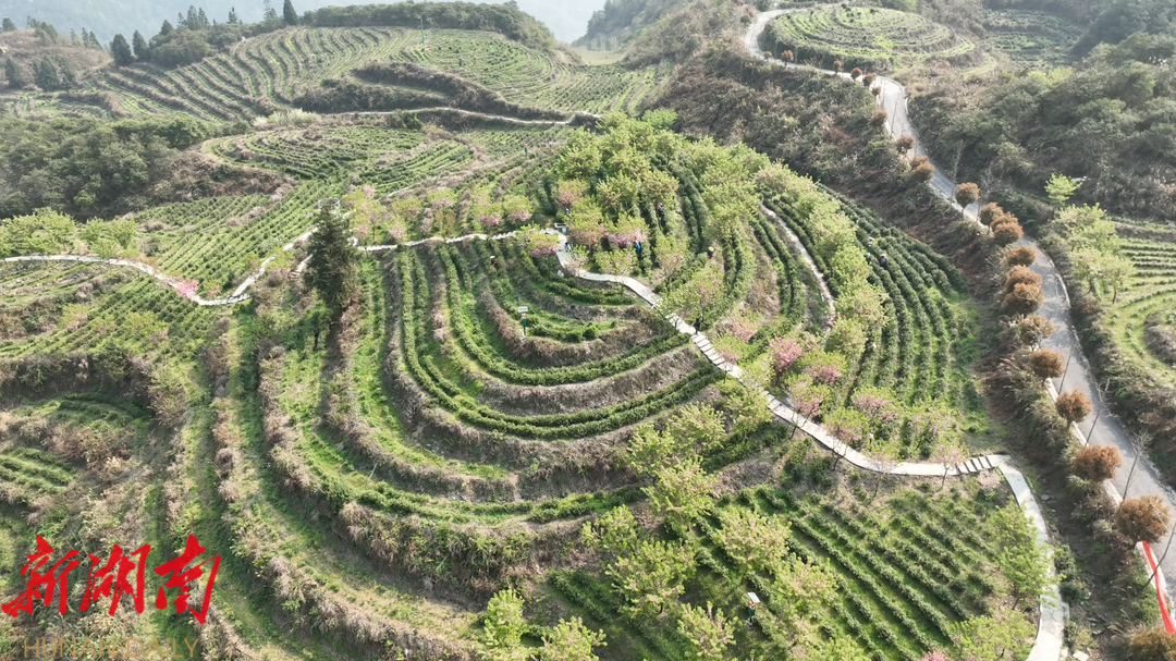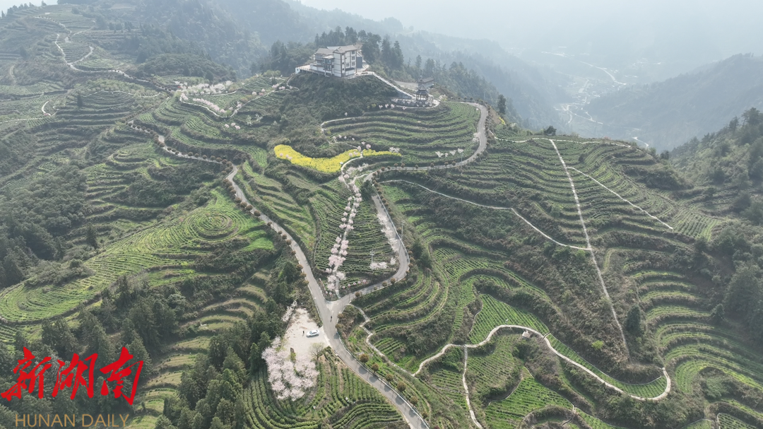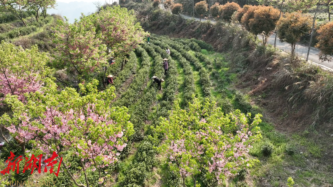 新湖南客户端3月28日讯(通讯员 张棋铭 陈丹丹 郑湘 苏世佳 ) 春满武陵,茶山叠翠。3月2 7 日,在 湖南省湘西州 古丈县默戎镇翁草村 ,“ 白叶一号 ” 生态茶园迎来今春首采 。 绯云般的花海与翡翠似的茶园在云雾中若隐若现,慕名而来的游客驻足观景台,无人机镜头里定格下这幅“樱为茶裳,茶作樱榻”的生态画卷——这正是翁草村推进“茶林共生”生态种植模式带来的诗意馈赠。