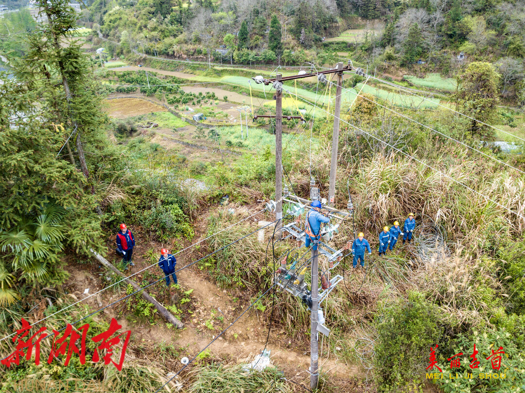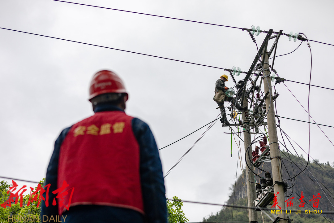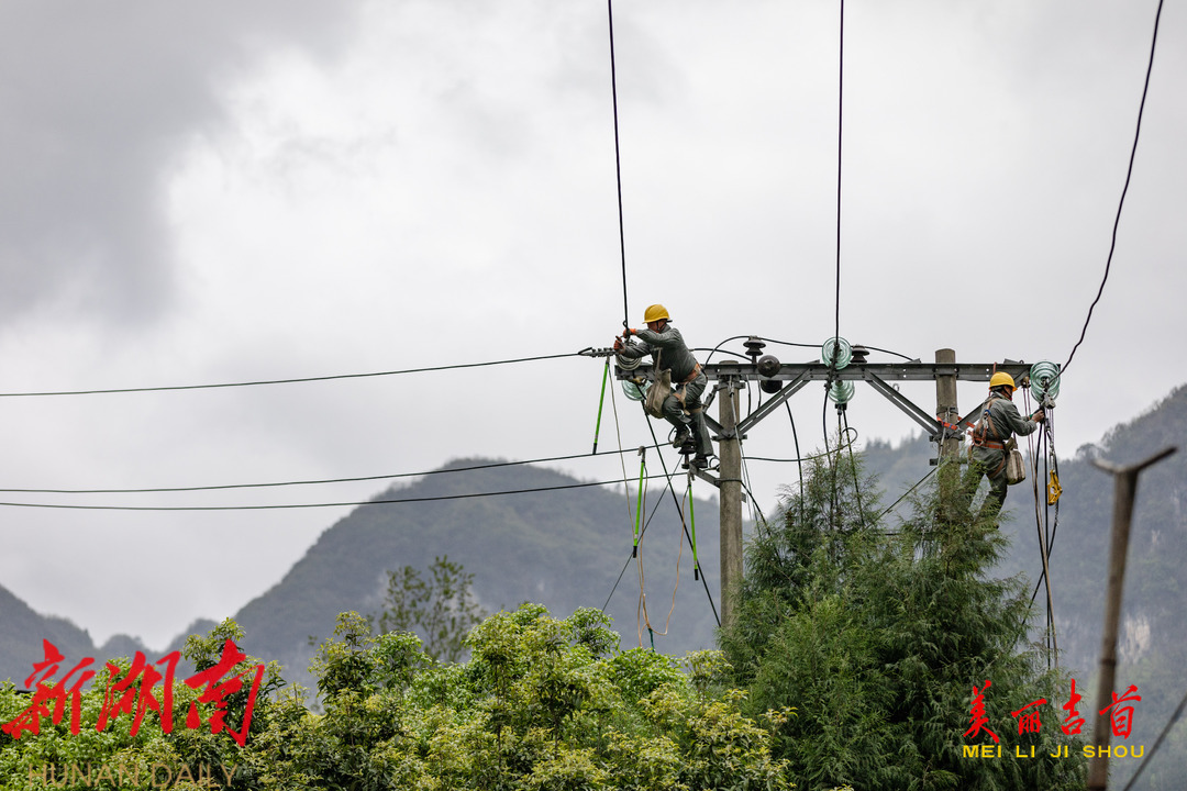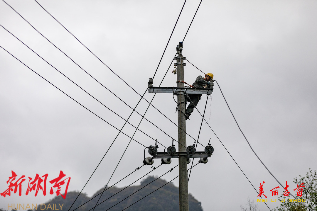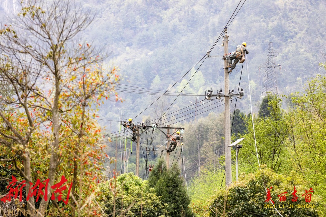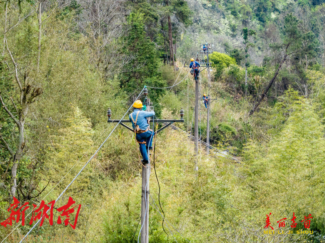 吉首市融媒体中心3月29日讯(全媒体记者 彭璟 通讯员 田赟 )2025年3月29日,吉首市矮寨镇坪朗村,国网湘西矮寨供电所员工在进行10千伏矮阳线综合治理施工。电力人员通过更换绝缘线、防雷限压器等措施,消除线路安全隐患,提高线路抗灾害能力,有效提升雷雨季节供电可靠性,确保苗寨村民安全稳定用电,为乡村振兴注入强劲电能保障。
