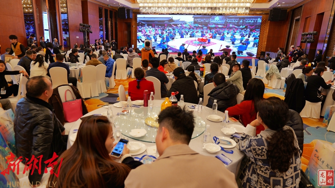 推介会在土家迎客歌悠扬的旋律中开场,身着民族服饰的土家儿女踏歌而行,将酉水河畔的淳朴风情洒向澄碧如绣的锦江河畔。大屏幕上,文旅宣传片徐徐展开,里耶秦简与仙佛寺石窟和酉水河相伴千年,八面山的云海日出与杨梅古寨的百年古道相映成趣,镜头在乌龙山大峡谷与卯洞峡的壮丽风光中穿梭,红色绸带串起了茨岩塘、太平山、犀牛潭和共和国勋章获得者张富清老英雄的家乡,引得满座宾客恍惚间踏入了“舟行清波上,客醉两省间”的诗意长卷里,大家纷纷举起手机记录这一美妙时刻。