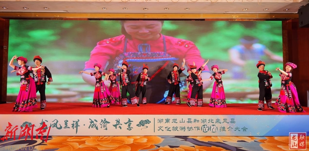龙山县融媒体中心3月29日讯(记者 王涯彬 通讯员 胡域 周金标)酉水烟波连锦江,龙凤和鸣醉蓉城。3月29日下午,“龙凤呈祥·成渝共享”湖南龙山县和湖北来凤县文化旅游协作推介大会的第一站在成都市热闹开启。龙凤土家儿女载歌载舞,用一台融山水之韵、文化之美、协作之智的文旅盛宴,热情诚挚地向当地市民发出“春日邀约”。