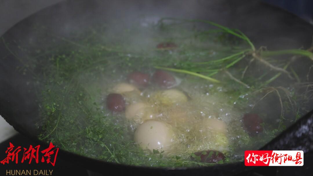 “阳春三月三,荠菜赛仙丹”。荠菜又称地菜,味甘、性平、偏寒,具有清肝明目,健脾利尿的功效,也有“聚财”和“好运”的寓意。每到农历三月初三,衡阳县不少地方保留着荠菜煮鸡蛋这一民间习俗。新鲜的荠菜清洗干净后放入锅中,加入适量清水,放上几颗鸡蛋,佐以红枣、姜片,大火煮沸后再转小火,然后将鸡蛋壳轻轻敲碎,再焖上几分钟,就更加入味。荠菜煮鸡蛋出锅后可以直接吃鸡蛋与红枣,也可以喝荠菜汤,这不仅是一道春日限定美食,更是一种文化的传承。
