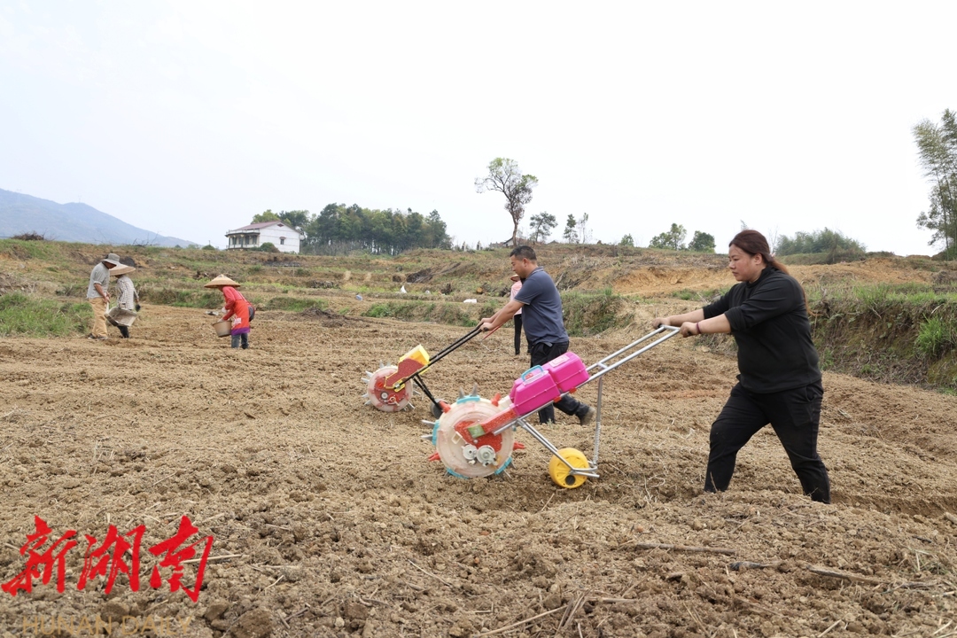 “株距行距大一点,坑洞再深一点。”在播种现场,农技员正手把手示范和讲解播种深度、播种密度、施肥比例等,确保标准化种植落地落实。从备耕开始,当地农技人员便驻点指导农户科学种植,让种植户心中有数、心中有底。