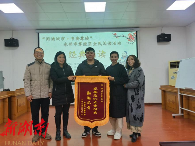 湖南日报·新湖南客户端3月31日讯(通讯员 蒋文明 高昌荣 蒋慧)3月29日,零陵区图书馆内洋溢着温暖与感动。读者宾瑞意、宾瑞旗将一面写有“感恩大爱付出 勤勉尽责”的锦旗送至图书馆,以此感谢公益国学班对孩子们成长的悉心培育。这一暖心举动,为正在火热开展的“读论语·走天下”全民阅读活动增添了温情注脚。