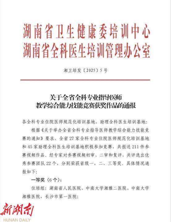 湖南日报·新湖南客户端3月31日讯(通讯员 刘畑) 近日,湖南省卫健委全科医生培训管理办公室主办的第四届全科专业指导医师教学综合能力技能竞赛落下帷幕。中南大学湘雅医院全科团队的杨光博士与湘雅全科住培基层实践基地—四方坪社区服务中心联合参赛的姜芳玉主任医师团获得一等奖,长沙市第一医院全科医学科和医院实践基地新河街道卫生服务中心派出的团队获得一等奖 。这一成绩背后,是开福区卫生健康局在基层医疗人才培养方面持续发力、创新举措的生动缩影。