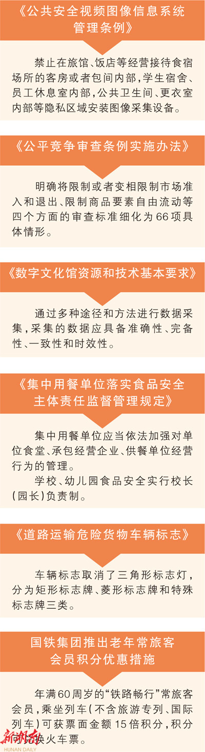 编者按:公共安全视频系统管理单位应当合理确定图像采集设备的安装位置、角度和采集范围,并设置显著的提示标识;细化完善公平竞争审查总体要求、审查标准;集中用餐单位应当依法加强对单位食堂、承包经营企业、供餐单位经营行为的管理……4月起,《公共安全视频图像信息系统管理条例》《公平竞争审查条例实施办法》《集中用餐单位落实食品安全主体责任监督管理规定》等一批新规施行,聚焦群众关切,以法治力量推动经济社会高质量发展。