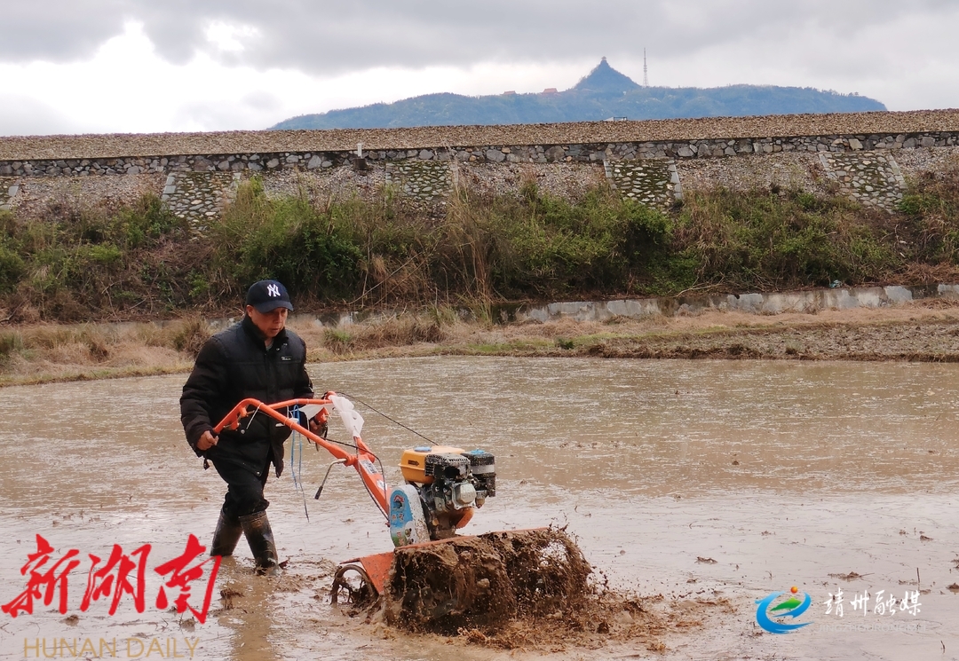 靖州融媒4月1日讯 (通讯员 梁华) 4月1日,靖州苗族侗族自治县渠阳镇塘湖村水稻种植点,农机手正驾驶"小铁牛"进行耕地,轰鸣声奏响出美妙的闹耕进行曲。