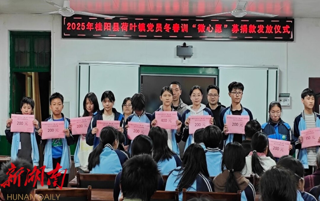 新桂阳4月1日讯(通讯员 陈锦妍)3月28日,荷叶镇举办党员冬春训“微心愿”募捐款发放仪式,现场暖意融融。此次活动以“点亮微心愿,情暖学子心”为主题,共筹集募捐款 12870 元,63 名家庭困难学生获得资助。