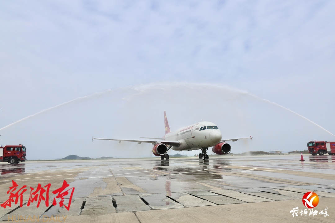 湖南日报·新湖南客户端4月1日讯(通讯员 林彬 田仁峰)今天11时33分,“桂林⇌湘西⇌合肥”GT1107次航班平稳降落在湘西边城机场,并受到民航最高礼仪“水门礼”的欢迎。