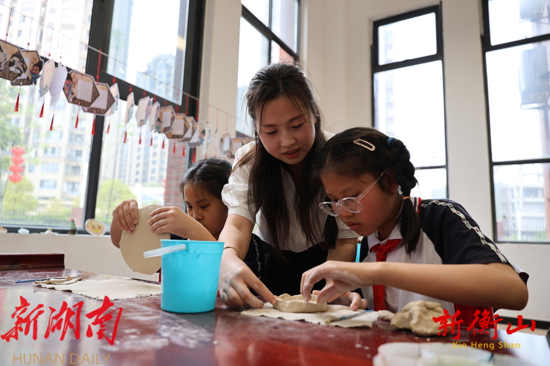 3月27日,衡山县城北小学开展以“多彩非遗 清明寄思”为主题的陶艺手工活动。孩子们 在老师的指导下, 将陶泥轻轻敲、拍,充满创意的揉、捏, 质朴可爱的小碗、圆润饱满的青团、栩栩如生的柳枝花卉等 形态各异的作品便在他们手中诞生。孩子们专注地为作品绘制上清明元素并上色,每一笔都饱含着对传统节日的理解与敬意。