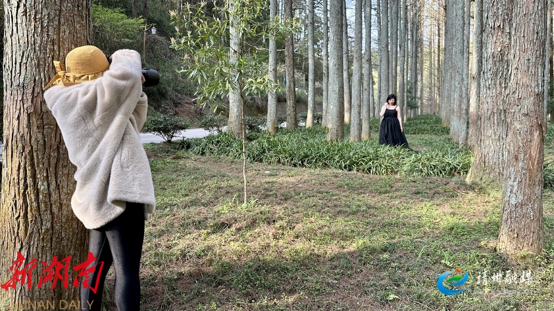 水杉林里,不少游客慕名前来打卡拍照(胡映辉 摄)