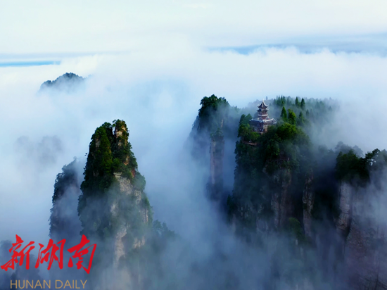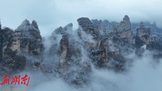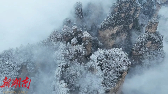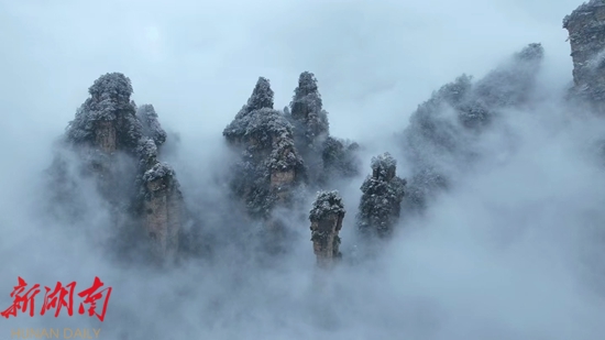 2月22日,天子山迎来入春以来最大降雪。轻纱似的云雾缠绕着奇峰异石,山峦在云海中时隐时现,宛如一幅幅流动的水墨画。春雪簌簌落下,山顶逐渐被白色所覆盖,树梢、草地和岩石上形成了一层薄薄的积雪,晶莹剔透、美不胜收。游客们在春雪中登山嬉戏、拍照留念,陶醉在冰天雪地的童话世界里,对如此壮丽的美景赞叹不已。
