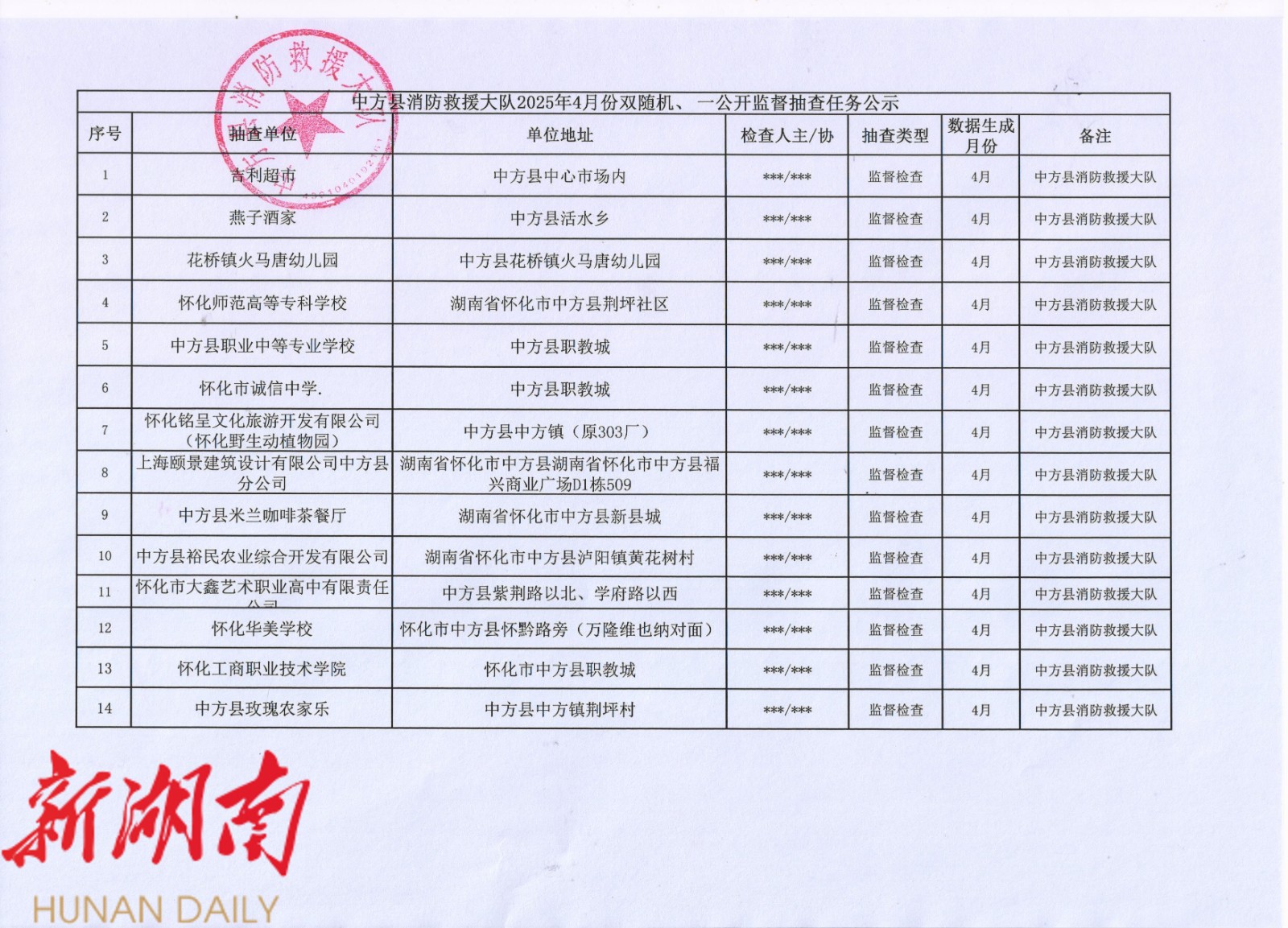 中方县消防救援大队“双随机、一公开”监督抽查任务公示
