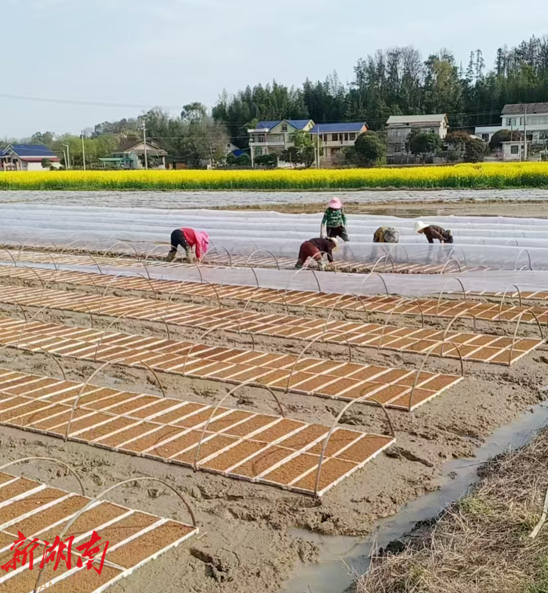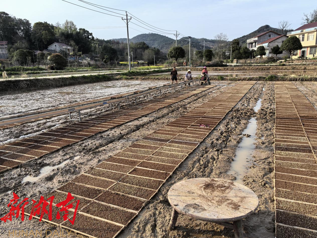 摆秧盘、施底肥、覆泥浆、平盘、播种、覆膜……在九溪镇土金村,村民们正有序开展水稻育秧工作,为即将到来的水稻插秧提供优质秧苗。