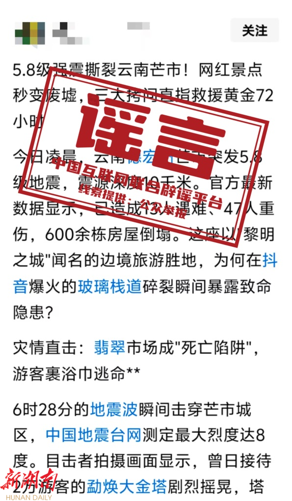 辟谣:云南德宏州芒市发生5.8级地震?勿信这些谣言!