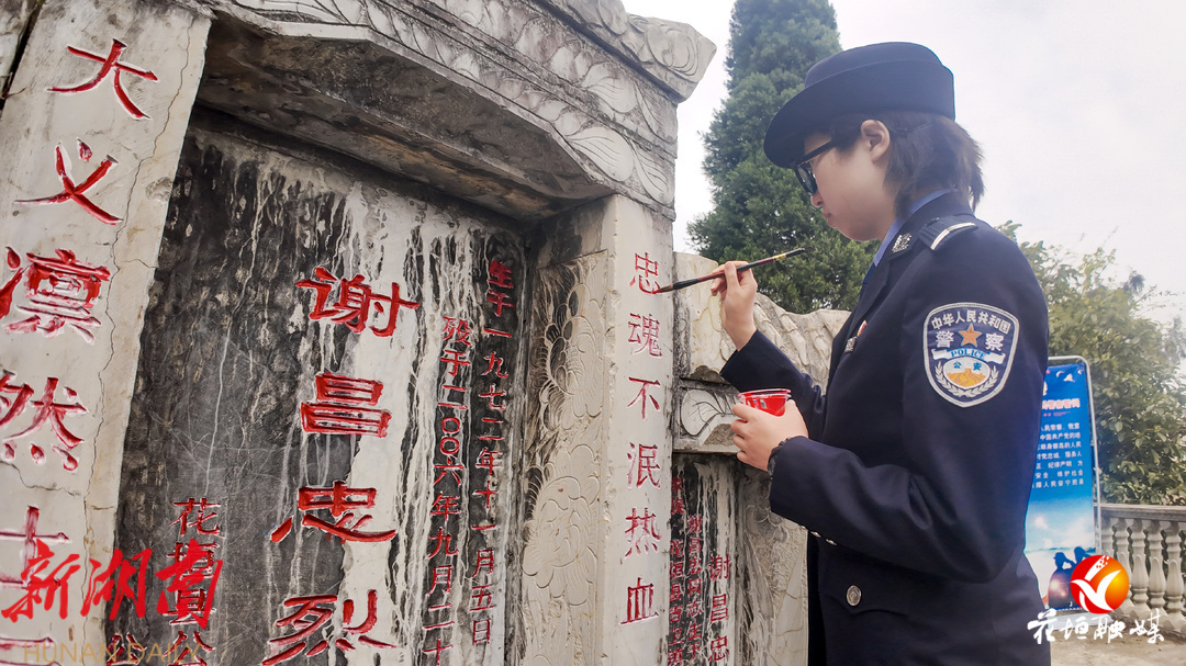 钟佛山苍松翠柏,忠魂浩气长存。在谢昌忠烈士墓前,湘西州20名新警与花垣县公安局民警整齐列队,向长眠于此的英烈敬献花篮、默哀致敬。身着警服的谢馨辉身姿挺拔,俯身为父亲墓碑描摹朱漆。
