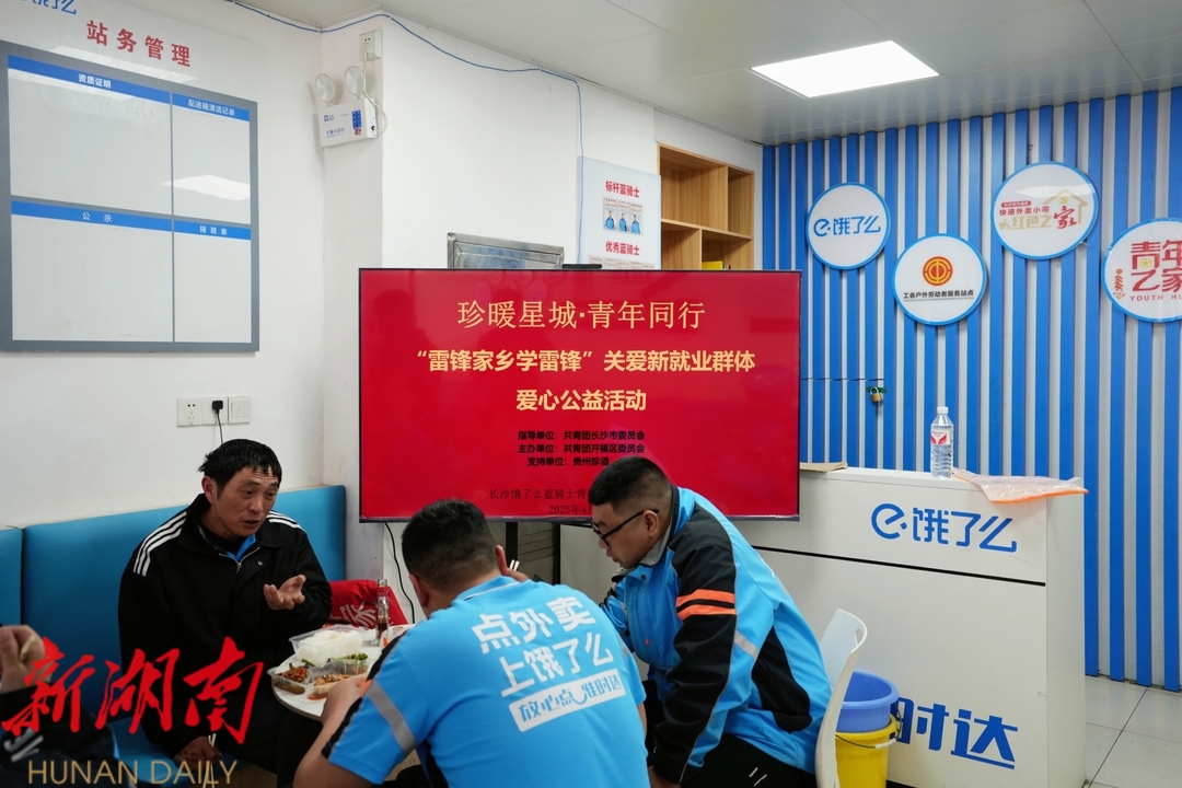 湖南日报·新湖南客户端4月2日讯(通讯员 张超群) 今天上午,由共青团长沙市委指导,共青团开福区委、贵州珍酒联合主办的“珍暖星城 青年同行——雷锋家乡学雷锋’关爱新就业群体爱心公益活动”,在红色之家——饿了么蓝骑士五一站启动。