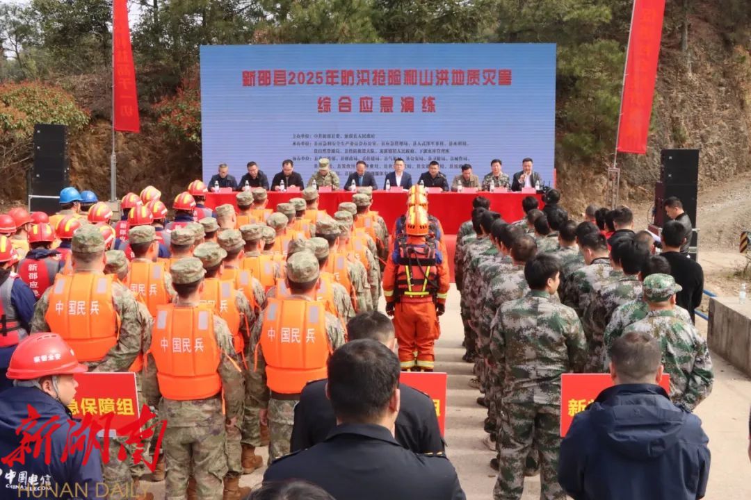 新新邵客户端4月3日讯 (记者 彭欢 张海兵 刘丈国 肖晔 陈望远) 4月2日上午10时,新邵县2025年防汛抢险和山洪地质灾害综合应急演练在龙溪铺镇下源水库拉开帷幕,以实战化模拟提高全县各单位防汛减灾应急响应和协调配合能力,检验应急预案的有效性和可行性,提升群众防灾避险意识,为新邵经济社会高质量发展营造安全稳定的环境。