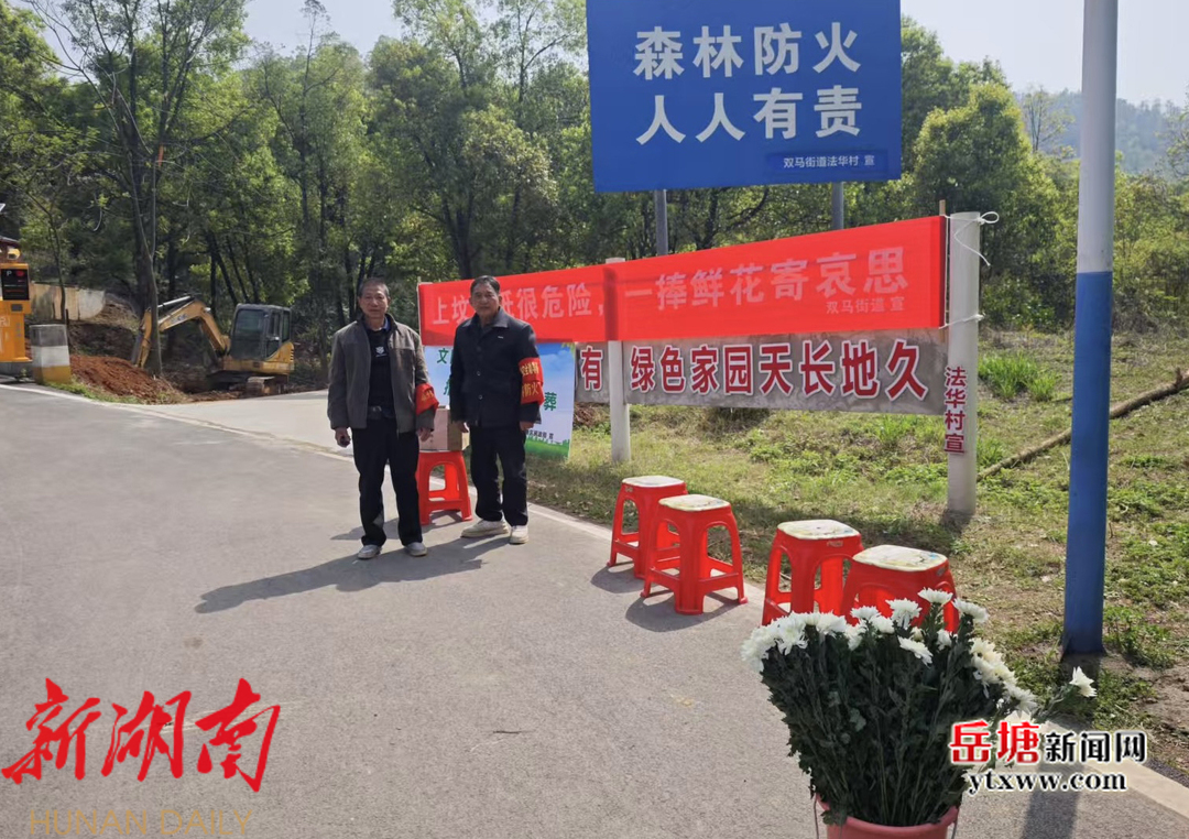 在岳塘区双马街道法华村中湾八字山路口,记者看到工作人员一边引导祭扫群众用携带的纸钱等换取鲜花,一边发放《2025年岳塘区清明节文明祭扫倡议书》,宣传绿色环保祭祀理念。