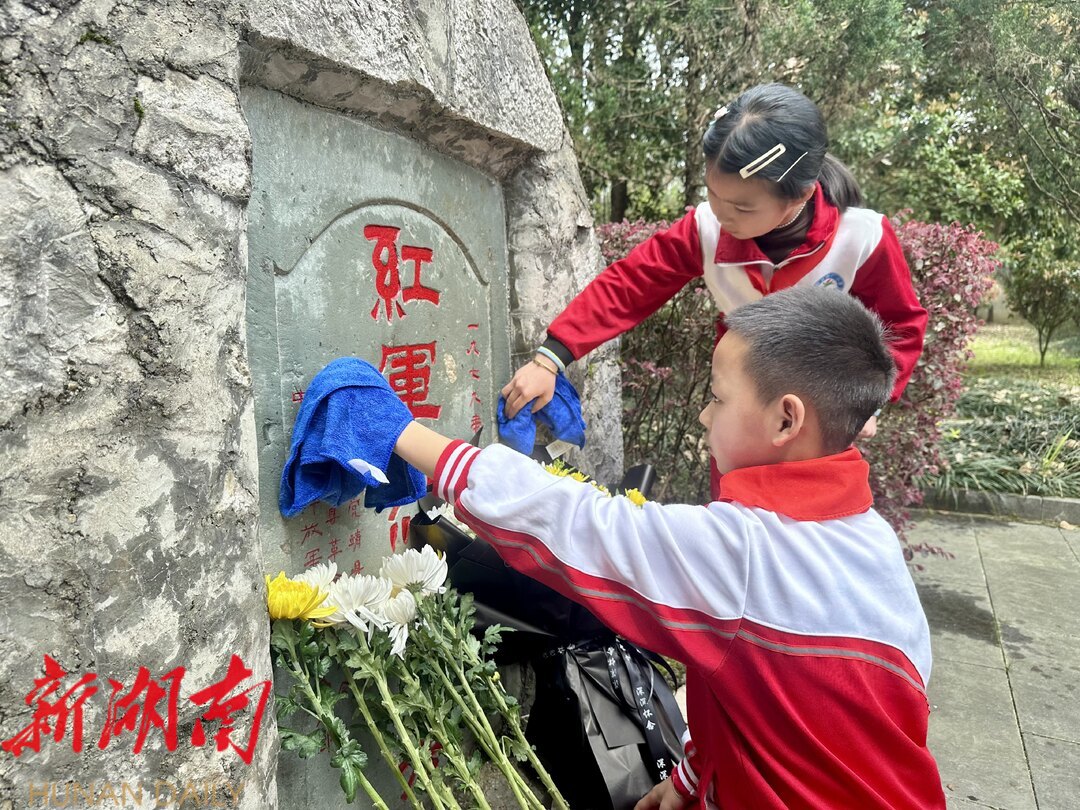 仪式结束后,少先队员来到红军墓前,仔细擦拭烈士墓碑,用实际行动守护红色记忆。