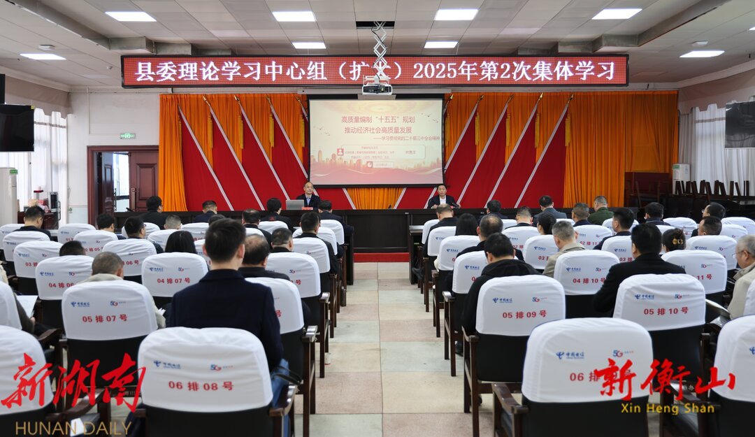 新衡山客户端4月3日讯(记者:李圣景 蒋鹏)4月3日,衡阳市政协副主席、衡山县委书记戴新贤主持县委理论学习中心组(扩大)2025年第二次集体学习,围绕“深入学习贯彻党的二十届三中全会精神,高质量编制‘十五五’规划,推动经济社会高质量发展”等进行专题学习。