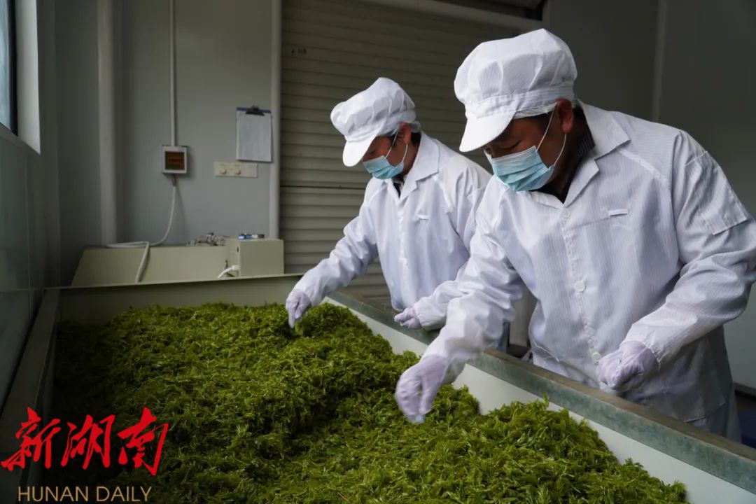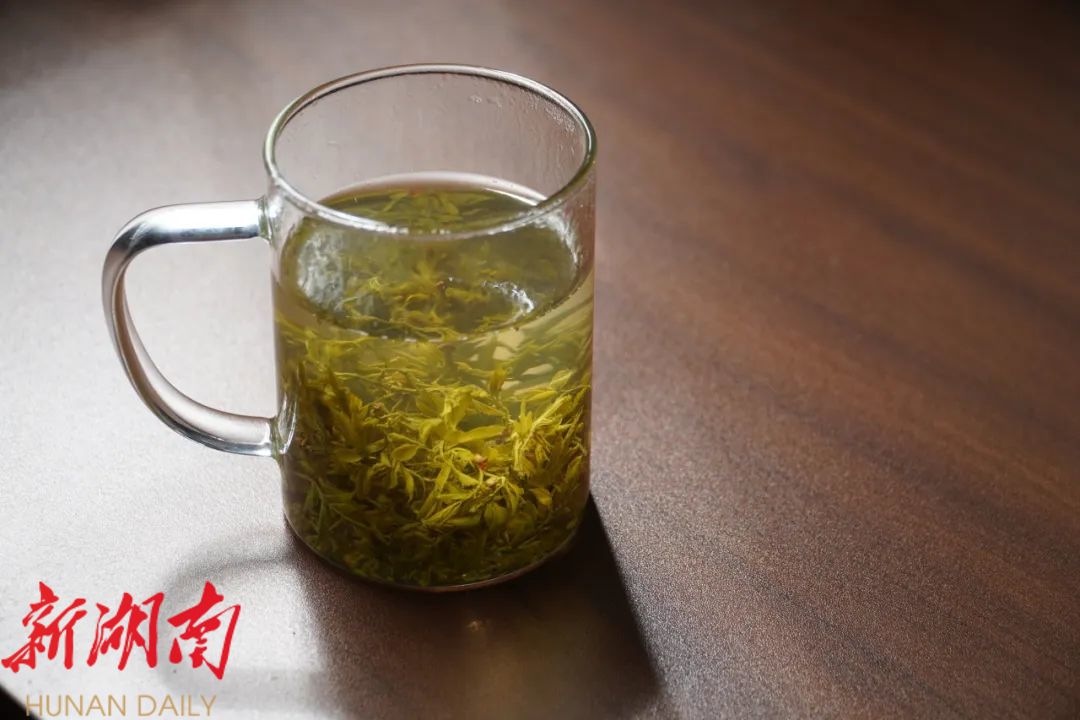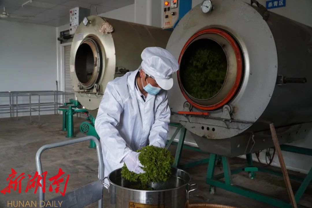 “这是今年春天生产的第一批有机茶,马上就要带着精美包装发往广东、湖北。”杨祚平告诉记者,新鲜的嫩芽采摘完成后,会立刻送往制茶车间进行加工,首先要摊青,然后放入机器杀青,再经过揉捻、析晶、松包、干燥等工序后才能出炉,每一步都必须非常精细,才能变成一杯杯回甘悠长、风味独特的张家界莓茶。