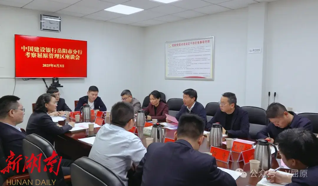 湖南日报·新湖南客户端4月7日讯(通讯员:姜瑶) 4月3日,中国建设银行岳阳市分行行长陈海龙带队来屈原管理区考察交流。屈原管理区党委书记向科军出席座谈会。区党委委员、区党委管委办公室主任彭典,建银咨询有限责任公司副总经理、高级经济师熊岳霞,中国建设银行岳阳市分行相关负责人,区发改局、区国有资本投资运营集团负责人参加。