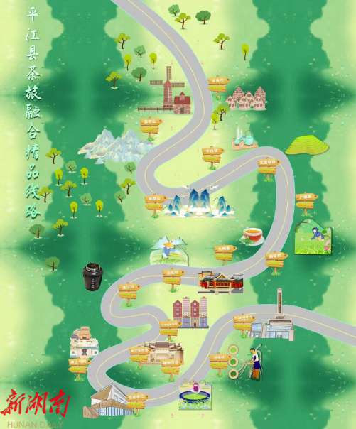 近年来,平江县按照“茶园景区化、茶旅一体化”的思路,大力发展集“游览观光、休闲娱乐、体验消费”于一体的茶旅融合综合体,打造了九狮寨连云山茶旅山庄、白云茶旅庄园、幽吉茶果旅观光园等茶旅融合新亮点。2021年,“平江县红色文化茶旅路线”获评全国百条红色茶乡旅游精品路线。2022年,湖南省九狮寨高山茶业有限责任公司被评为湖南省“十佳茶旅融合标杆企业”及“全国茶业百强企业”。2023年,平江县被评为全国“茶旅融合示范区”,"一片叶子"正串联起三产融合的致富链条。