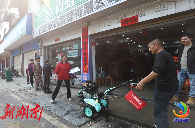 在麻阳江口墟镇集市上,一家小小的农机销售店忙得不亦乐乎。店主陈小凤一边忙着向农户介绍农机性能,一边帮农户算着怎么享受国家补贴购买更划算。短短十来分钟,店里就卖出了一台微耕机、一台单轨运输机。