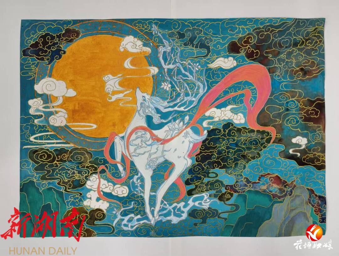 获奖作品《九色鹿》由花垣县民族中学学生孙子艺创作完成。作品取材于敦煌壁画,孙子艺同学用画笔巧妙融合敦煌壁画艺术与现代创作手法,以象征祥瑞的九色鹿为载体,通过绚丽的色彩和细腻的笔触,展现了中华传统文化的独特魅力。敦煌九色鹿壁画作为佛教艺术珍品,不仅承载着吉祥如意的美好寓意,更是古代丝绸之路上多元文明交流互鉴的生动见证。