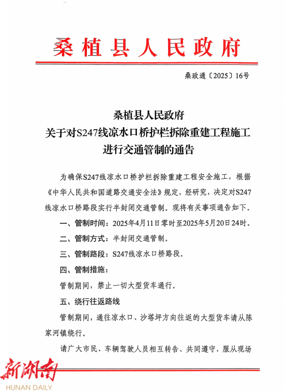 为确保S247线凉水口桥护栏拆除重建工程安全施工,根据《中华人民共和国道路交通安全法》规定,经研究,决定对S247线凉水口桥路段实行半封闭交通管制。现将有关事项通告如下。
