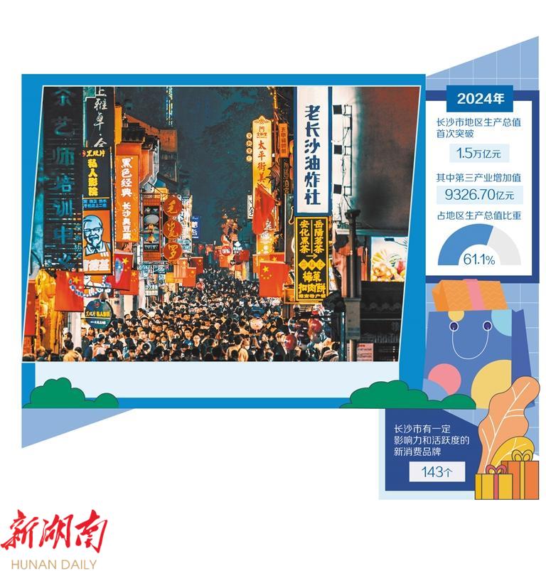 新消费品牌向阳生长,激发市场经济发展活力。长沙市统计局数据显示,2024年,长沙地区生产总值首次突破1.5万亿元,其中第三产业增加值9326.70亿元,占GDP比重达61.1%;社会消费品零售总额5797.71亿元、同比增长4.2%。