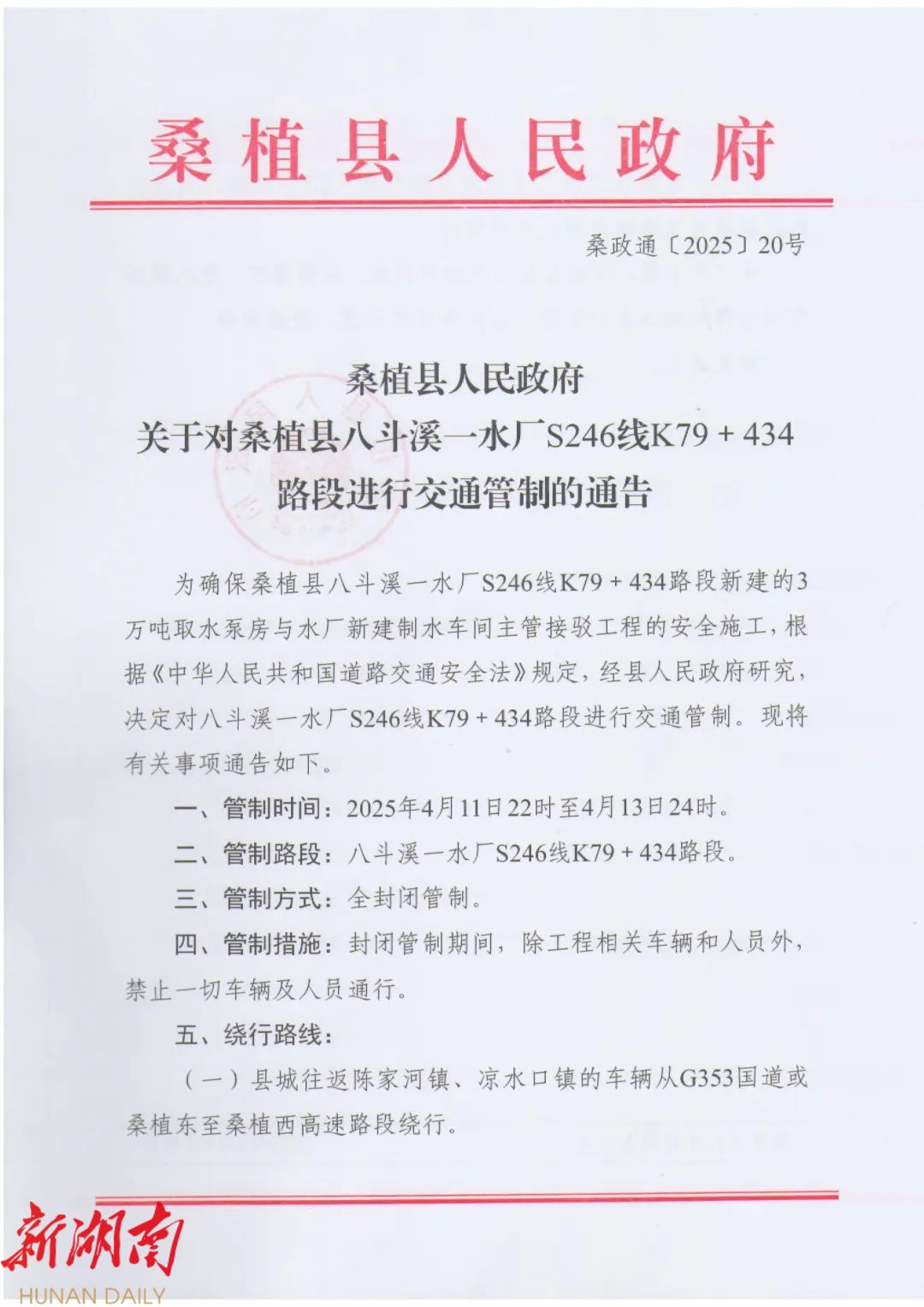 为确保桑植县八斗溪一水厂S246线K79+434路段新建的3万吨取水泵房与水厂新建制水车间主管接驳工程的安全施工,根据《中华人民共和国道路交通安全法》规定,经县人民政府研究,决定对八斗溪一水厂S246线K79+434路段进行交通管制。现将有关事项通告如下。