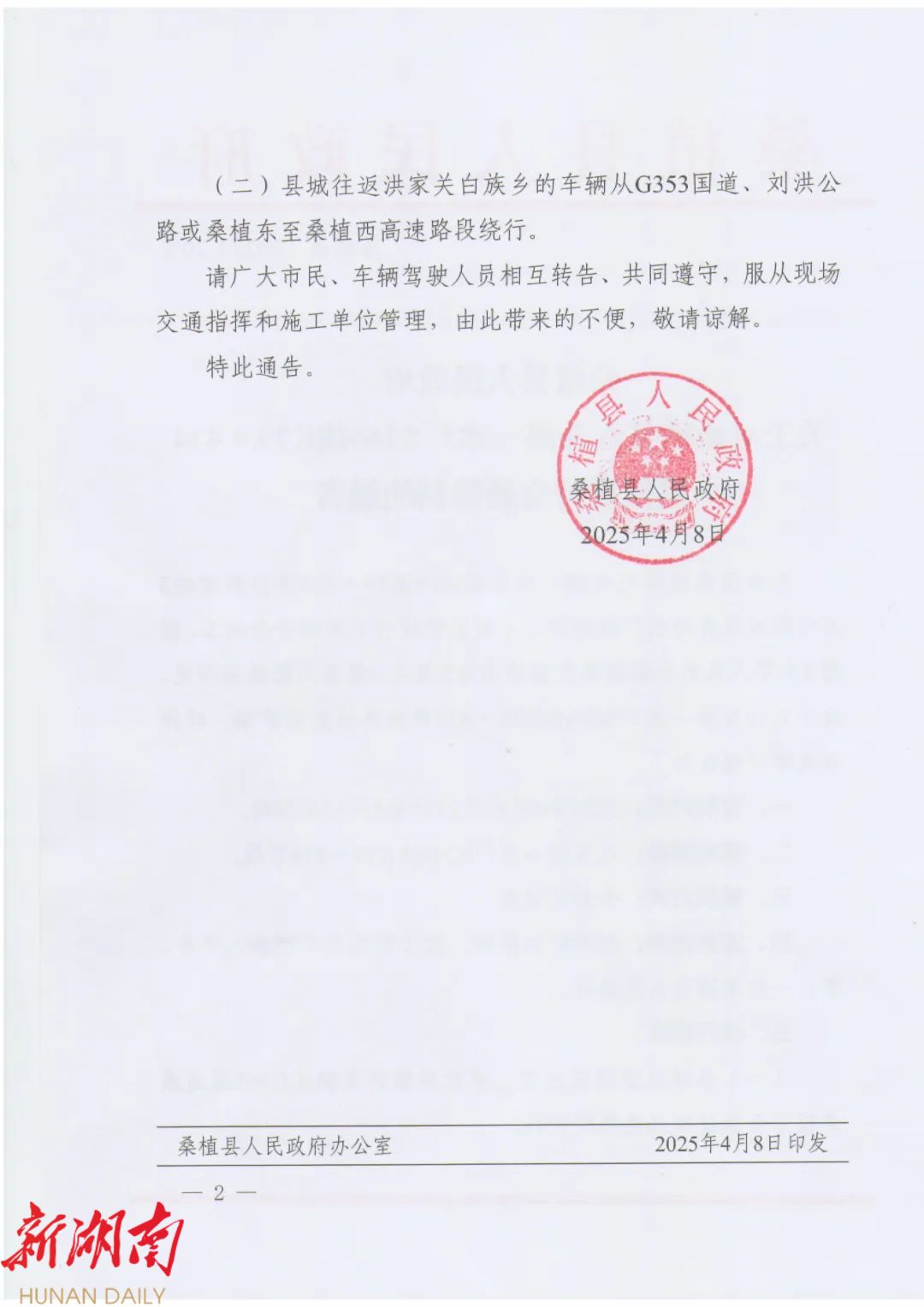 (二)县城往返洪家关白族乡的车辆从G353国道、刘洪公路或桑植东至桑植西高速路段绕行。