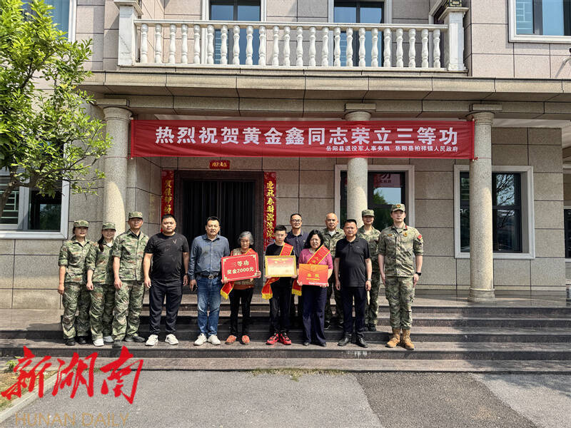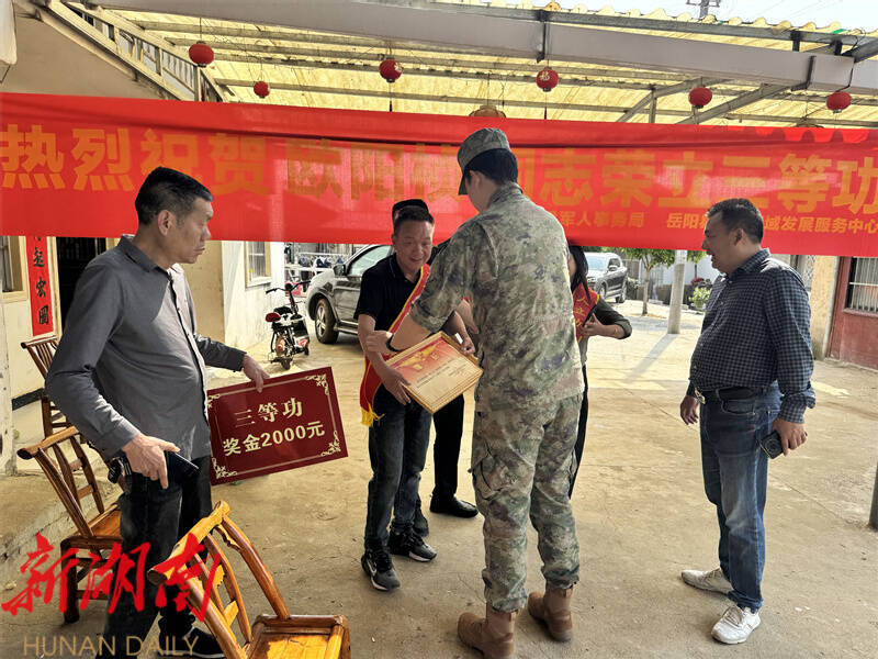 湖南日报·新湖南客户端4月10日讯(通讯员 尹宇豪) 4月9日,岳阳县人武部、岳阳县退役军人事务局先后前往荣家湾街道、柏祥镇、张谷英镇,为荣立“三等功”或先进个人的现役军人欧阳桢、邹猛、黄金鑫、陈石武等送去立功喜报,让军人军属共享尊崇荣光。