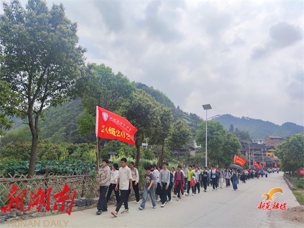 晨曦掠过侗乡鼓楼时,师生们的运动鞋已沾满田间露水。一路上,语文老师带学生吟诗作对,数学老师现场出题计算路程,物理老师就地取材分析受力原理,生物老师指导辨认蕨类植物,美术老师则以侗寨风光为生动教材。师生们在行走中观察、学习,欢声笑语与沿途村寨美景相映成趣。这场 “教育即生活” 的体验,将课本知识化作可触摸的记忆,让同学们上了一堂别开生面的实践大课。