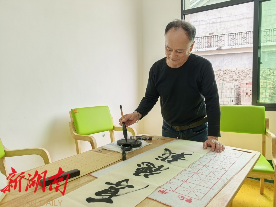 在藕团村佘家湾互助养老服务中心,书法爱好者佘章凯是这里的“常客”,他每天来此书法创作,乐在其中。