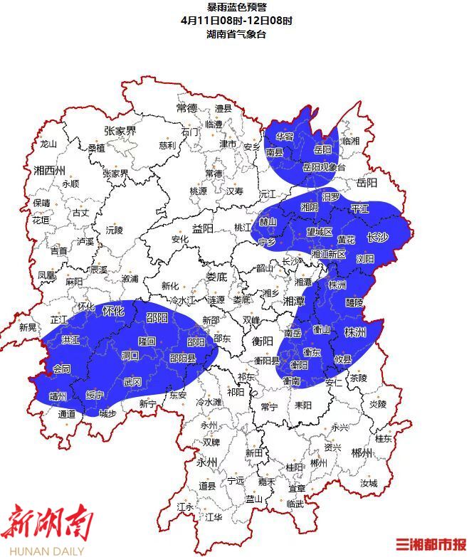 湖南省气象台4月11日6时发布暴雨蓝色预警:预计11日8时至12日8时,长沙、株洲、湘潭东南部、衡阳东北部、邵阳、岳阳、益阳东部、怀化南部将出现暴雨,并伴有短时强降水、雷雨大风、冰雹等强对流天气,请加强防范。