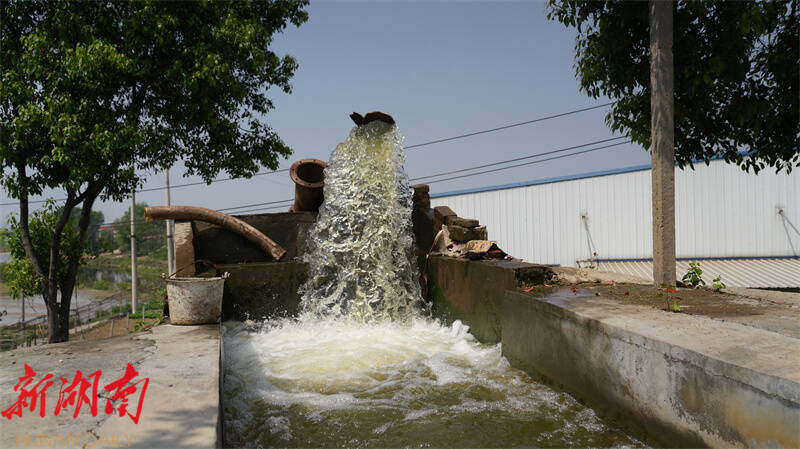 筻口镇是岳阳县最大的粮食生产镇,在该镇潼溪村省级万亩粮食示范片,党的二十大代表、丰瑞农机专业合作社理事长董敏芳正与社员一起查看泵站出水情况。
