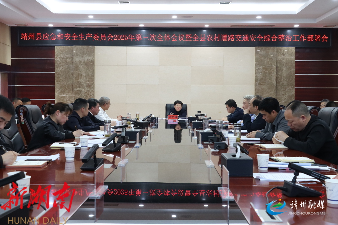 靖州融媒4月12日讯 (记者 许梦娟)4月11日, 靖州苗族侗族自治县应急和安全生产委员会2025年第三次全体会议暨全县农村道路交通安全综合整治工作部署会召开,县委书记黄忆钢出席会议并讲话。她强调,要深入学习贯彻习近平总书记关于安全生产的重要论述,认真贯彻落实全省全市安全生产电视电话会议精神,要始终绷紧安全这根弦,下更大功夫、花更大气力,全方位开展安全隐患排查整治,守护人民群众生命财产安全。县委副书记、县长张艳阳主持会议,县人大常委会主任杨景明,县政协主席姜小华 , 县领导 陈建平、谢科、廉剑晖、金波、蒋和平、梁小彬、陈运珍参加。