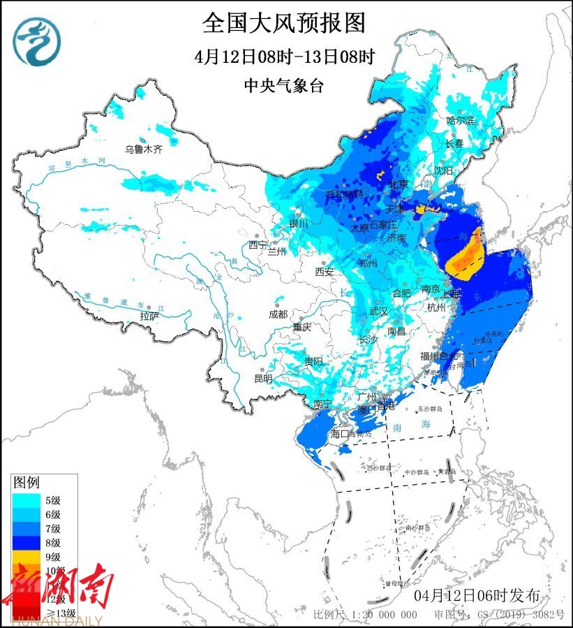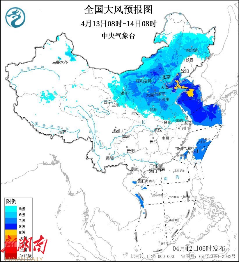 预计,4月12日8时至13日8时,东北地区、江汉、江淮、江南北部、四川盆地等地有5~6级大风,内蒙古、西北地区东北部、华北、黄淮等地有6~8级大风,阵风9~11级,其中,内蒙古中部、山西北部、河北北部、北京西部和北部山区等地局地阵风可达12~13级;渤海、渤海海峡、黄海大部海域、东海大部海域、台湾海峡、台湾以东洋面、南海北部海域、北部湾将有7~8级、阵风9~10级的大风,其中渤海南部、渤海海峡、黄海南部和东海北部的部分海域风力可达9~10级、阵风11~13级。