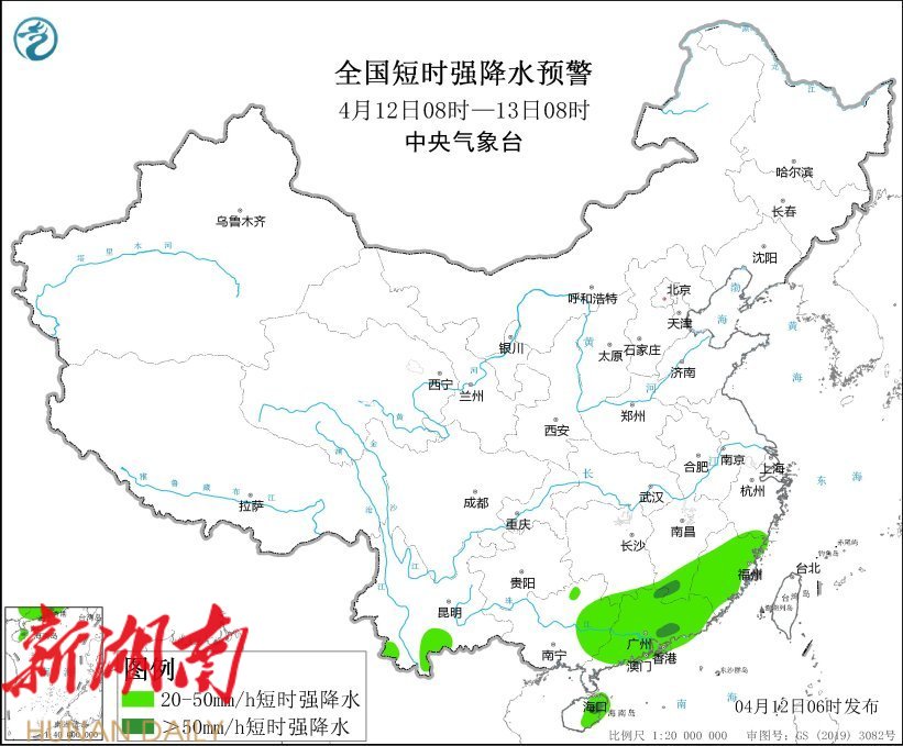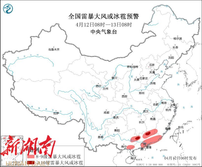 预计4月12日8时至13日8时,江南南部、华南中东部等地的部分地区将有8级以上雷暴大风或冰雹天气,其中,江西南部、广西东北部、广东北部等地的部分地区将有10级以上雷暴大风,最大风力可达11级以上 ;江南东南部、华南中东部等地的部分地区将有小时雨量大于20毫米的短时强降水天气,其中,江西南部、广东中部和北部、海南岛东北部等地的部分地区小时雨量大于50毫米,最大可达60毫米以上。