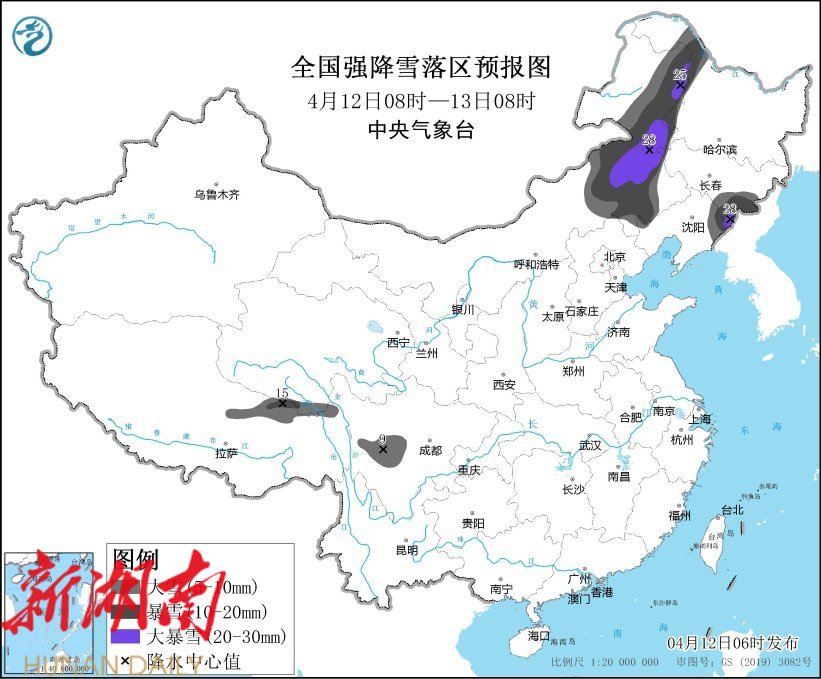 预计4月12日8时至4月13日8时,内蒙古中东部、黑龙江西部、吉林西部和东部、辽宁东北部、西藏东北部、川西高原中部等地部分地区有大到暴雪,其中,内蒙古东部、吉林东南部等地部分地区有大暴雪(20~28毫米)。上述部分地区新增积雪深度5~15厘米,局地可超过20厘米。