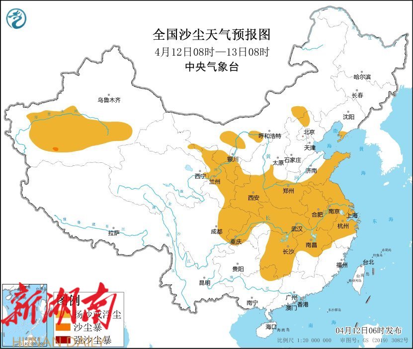 受冷空气大风影响,预计4月12日8时至13日8时,内蒙古西部、新疆南部、甘肃中东部、宁夏中南部、陕西中南部、山东东部和南部、河南、安徽、江苏、上海、湖北、湖南、广西北部、江西北部、浙江中北部、四川盆地中北部等地的部分地区有扬沙或浮尘天气 ,其中,新疆南部等地局部有沙尘暴 。